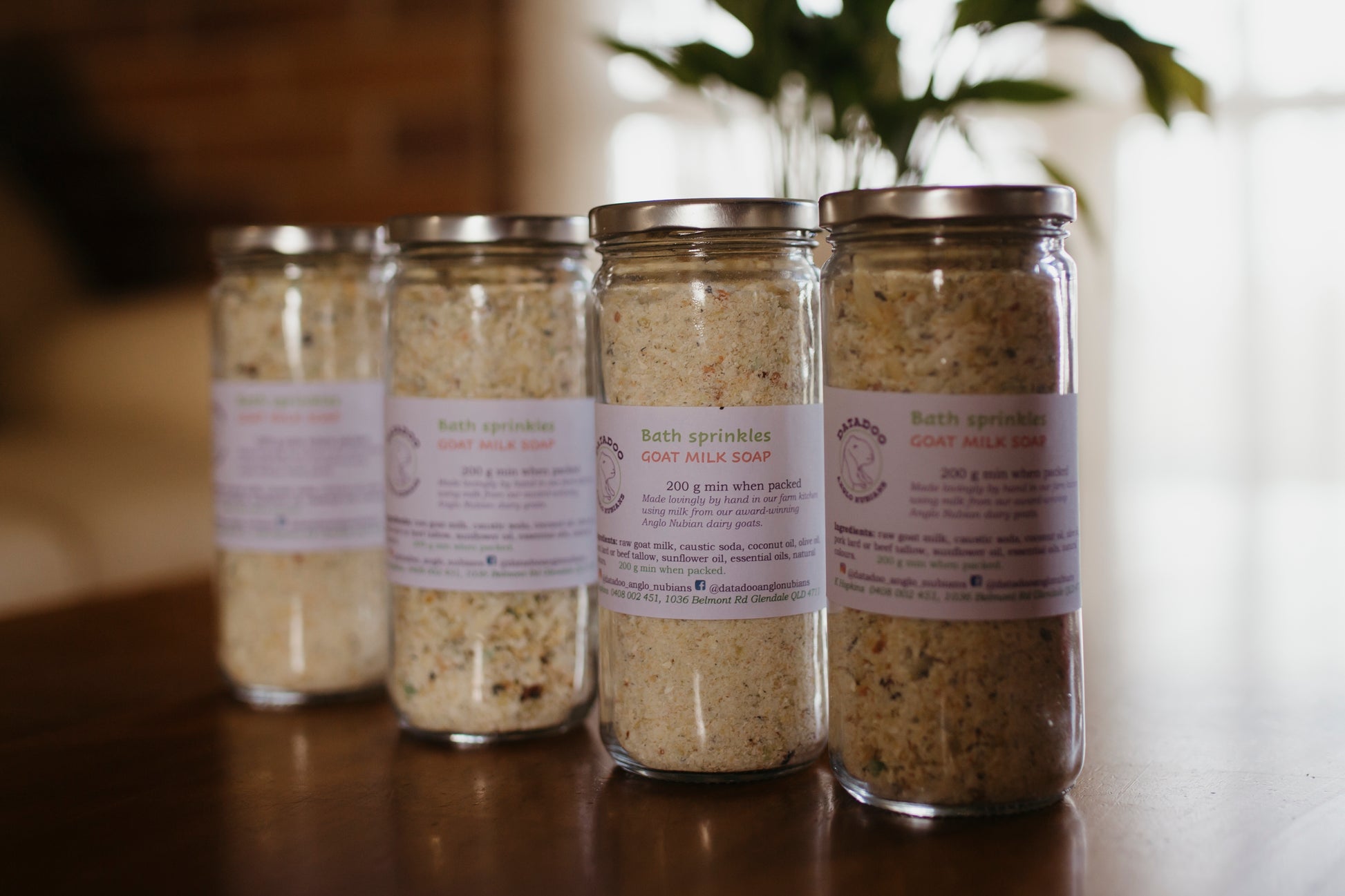 Ingredients: Raw goats milk (40%), caustic soda, coconut oil, olive oil, pork tallow, sunflower oil, essential oils, natural exfoliants and colourants. Minimum 200g when packed.