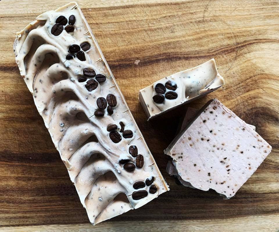 Ingredients: Raw goats milk (40%), caustic soda, coconut oil, olive oil, pork tallow, sunflower oil, Ginger essential oil, coffee, cocoa. Minimum 95g when packed.