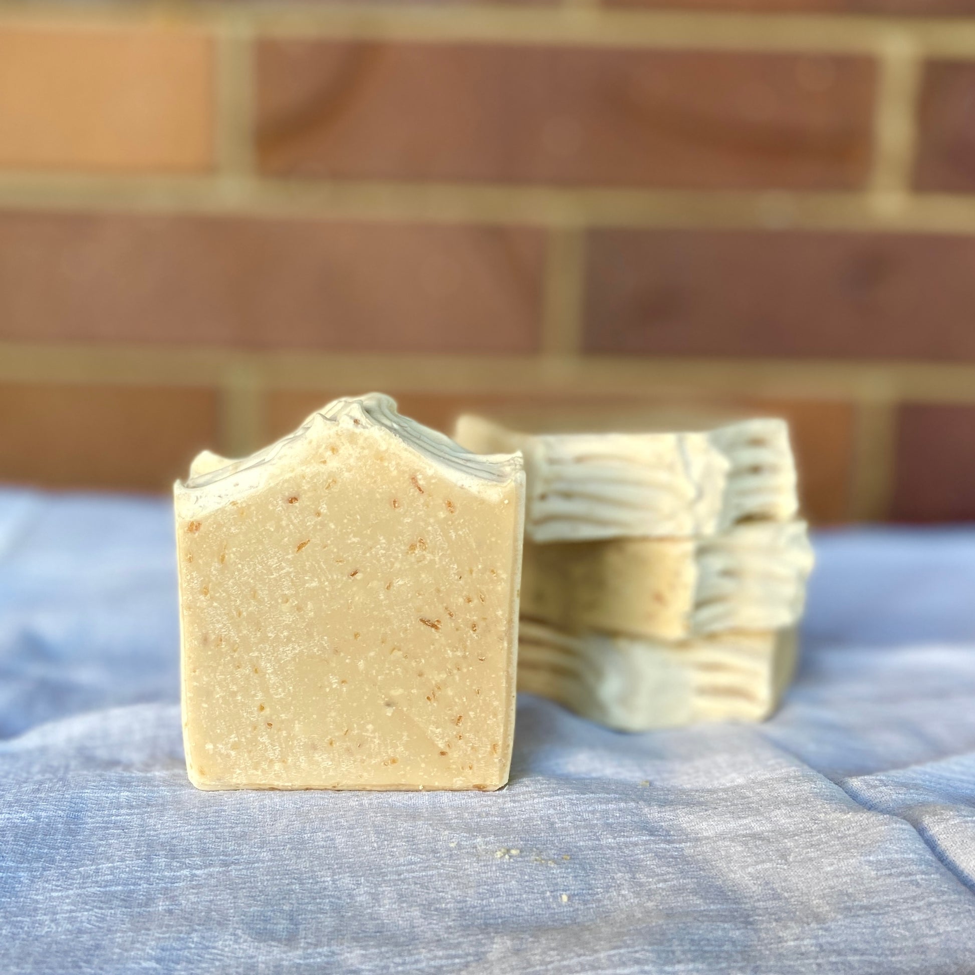 Ingredients: Raw goats milk (40%), caustic soda, coconut oil, olive oil, pork tallow, sunflower oil, honey, rolled oats. Minimum 95g when packed.