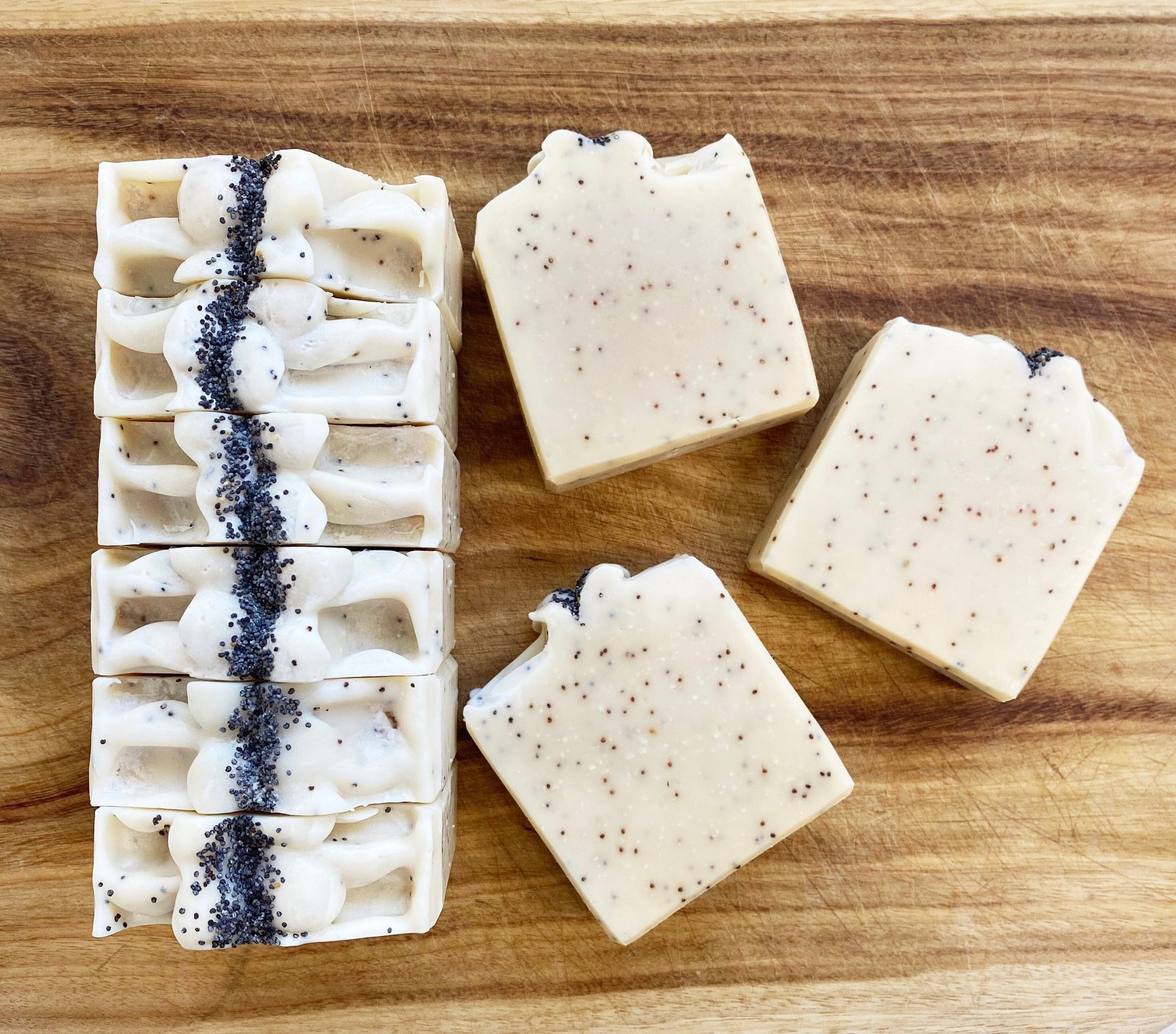 Ingredients: Raw goats milk (40%), caustic soda, coconut oil, olive oil, pork tallow, sunflower oil, Spearmint essential oil, poppy seeds. Minimum 95g when packed.