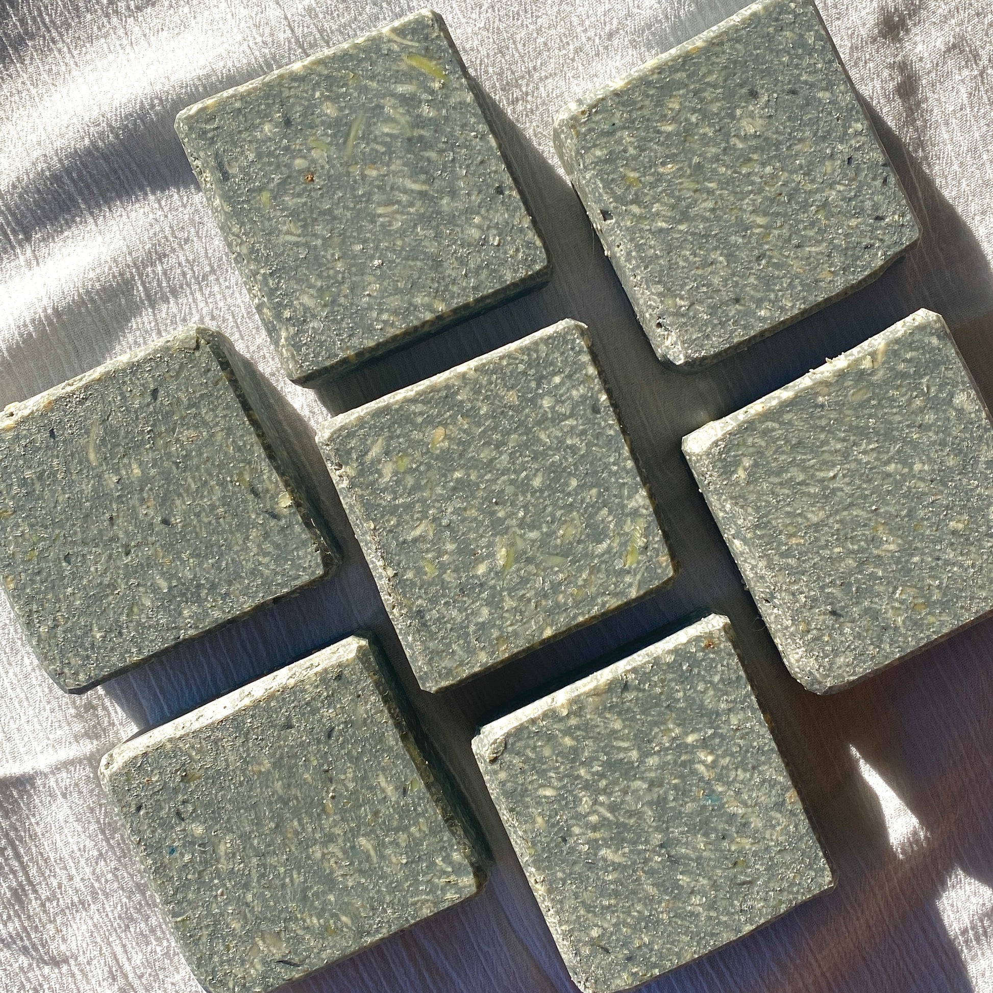 Ingredients: Raw goat milk, caustic soda, coconut oil, olive oil, pork lard or beef tallow, sunflower oil, essential oils (Eucalyptus, Tea Tree, Spearmint), colours (activated charcoal), extra soap shreds. Minimum 95g when packed.